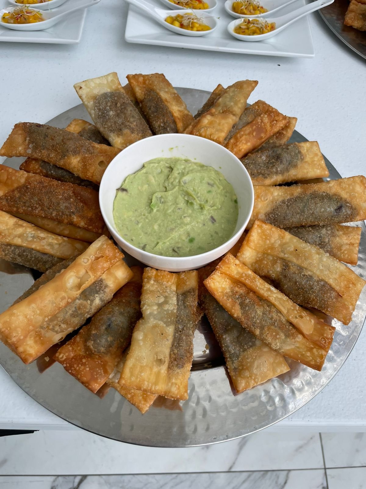 Enrolladitos de masa crocante a base de lomo saltado. Servido con reducción de lomo saltado o Guacamole